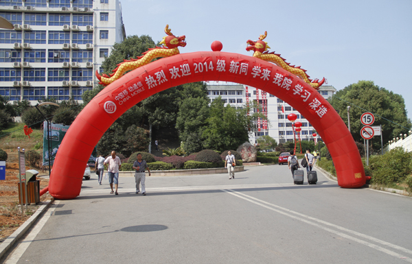 校园里,到处洋溢着无比喜庆的气氛;红色的气球凌空而起,鲜艳的彩旗迎风招展,挂满了欢迎新生的横幅和标语,充分表达了全院师生对朝气蓬勃的2014级新生的热切期待和热烈欢迎。