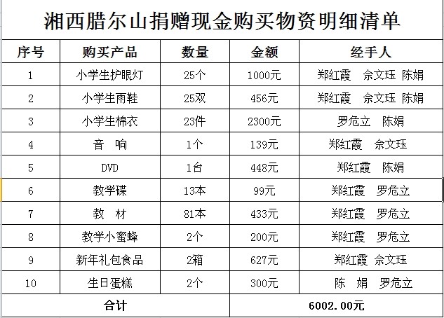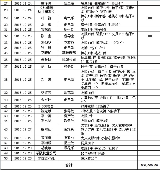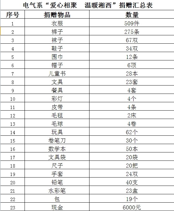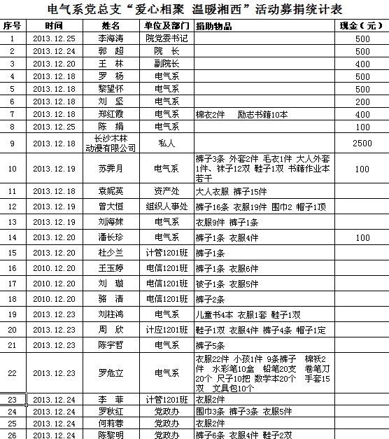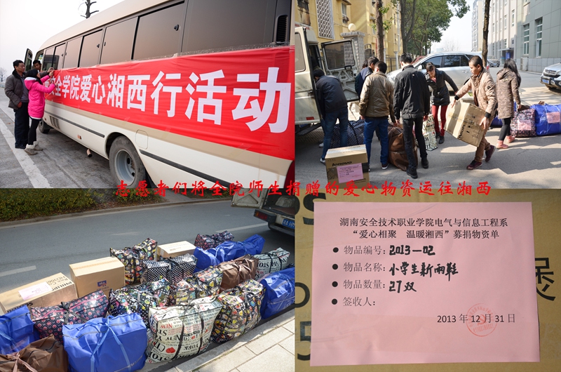 2013年12月21日至27日,电气系湘西行志愿小组在安院发起募捐,短短一个星期的时间,共收到来自安院师生的衣物一千多件,书籍、文具三百多套和6000元现金,12月31日志愿者将所捐赠物品打包、物流送往吉首。在此,非常感谢所有参与捐赠的老师和同学以及社会爱心人士,感谢电气系计管1301班肖磊同学的家长,捐赠一辆小型喀什特中巴车,让此次活动顺利开展。