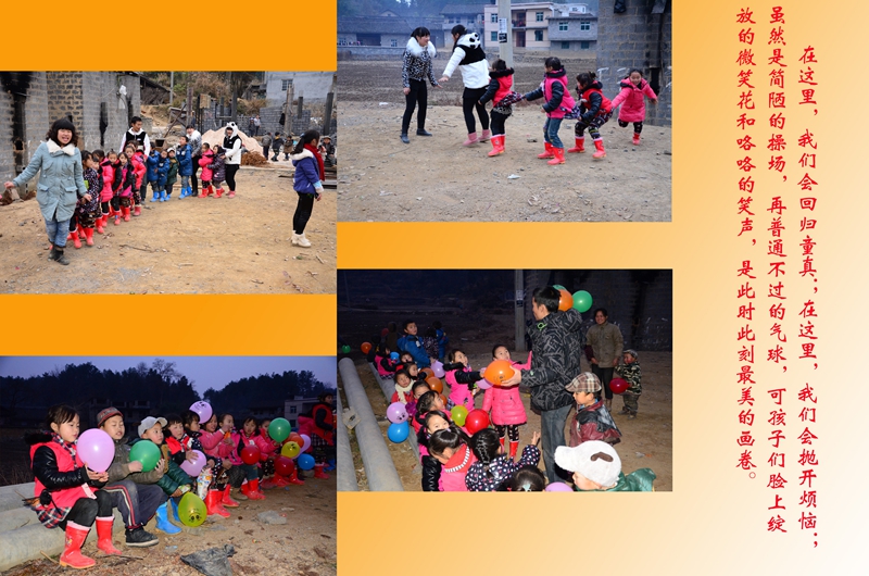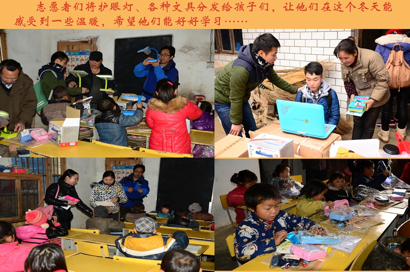 1月4日,学院师生一行18人承载着大家的爱心前往湘西凤凰腊尔山大教小学、板沟禾小学,将过冬衣物、书籍和文具送到孩子们手中。当我们到达大教小学时,如果不是一面鲜艳的五星红旗,你根本不知道那就是他们的学校(学校被认定为危房,现正在翻修中,孩子们只能在民房里上课)。随行的志愿老师用独特的方式给孩子们上了一堂生动而又难忘的课,随行的学生也圆了自己的教师梦。在现场,志愿者们给孩子们分发着爱心台灯、爱心衣物,大家都忙碌着,忘了旅途的艰辛,当孩子们换上新衣裳、新鞋子飞奔在田野山间时,脸上绽开的微笑花就是我们心灵最大的慰藉。