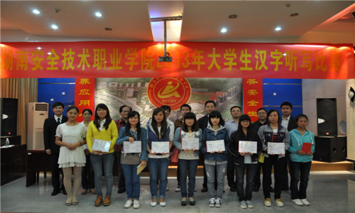 2013年我院大学生汉字听写比赛结果是,伍瑶(外语系)和曾旺(电气系)获得一等奖,谭琴(电气系)、刘华芳(烟爆系)和袁灿宇(外语系)获得二等奖,何美玲(外语系)、徐丹丹(外语系)、黄妮婷(外语系)、刘碧文(经贸系)、吴遵统(安全系)等5位同学获得三等奖。