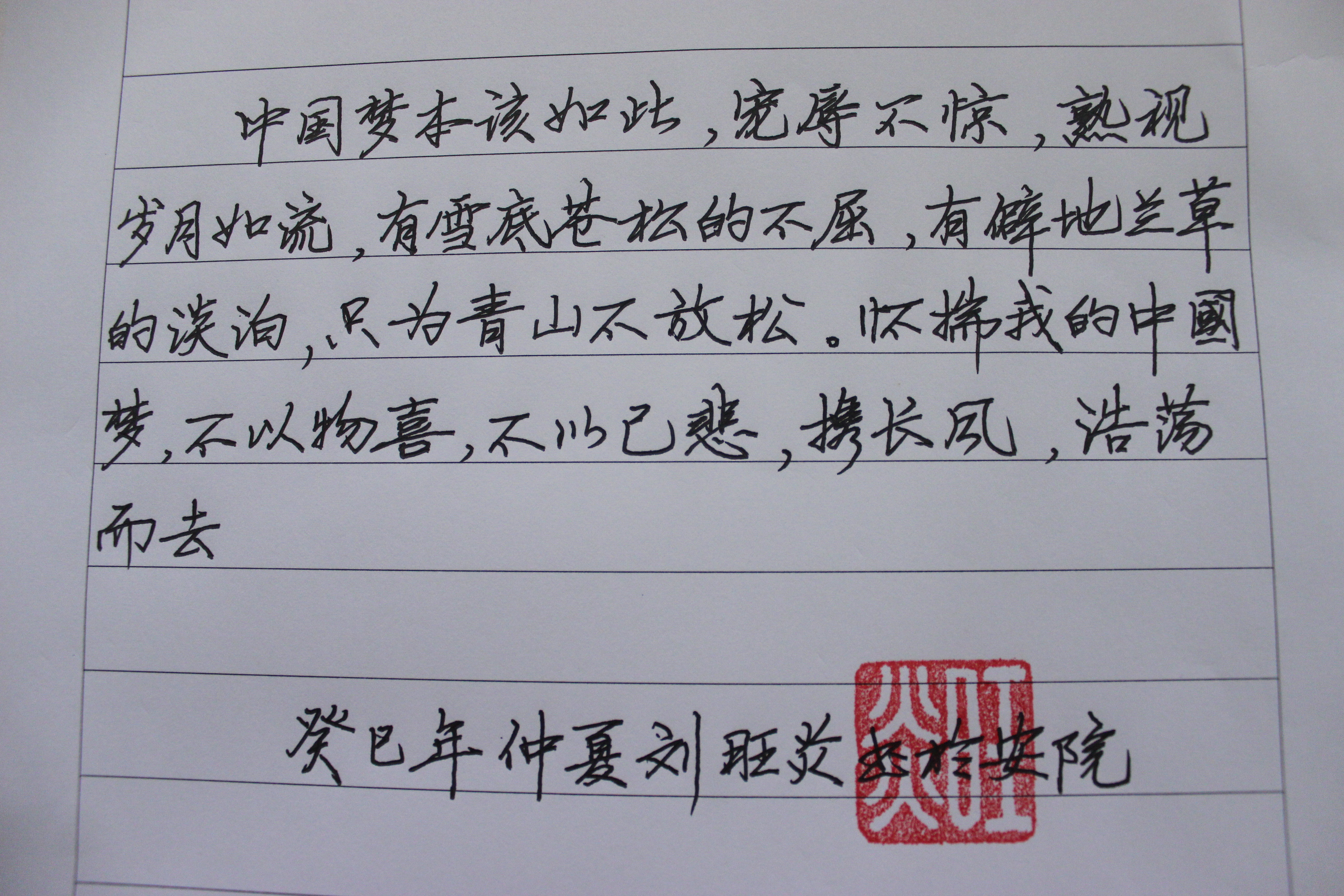 书法是一门学问,更是一门艺术。它不仅是中华民族的文化瑰宝,而且在世界文化艺术宝库中独放异彩。为进一步弘扬中国传统书法艺术,丰富校园文化艺术生活,增强同学们对书法艺术的学习兴趣,提高审美能力,院团委于6月20日下午联合长沙市天创物业管理有限责任公司在图书馆一楼大厅举行了“我的中国梦”书法大赛。