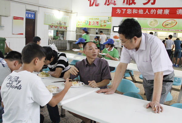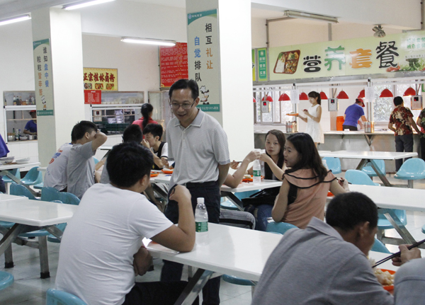 随后,李海涛、郭超一行来到了食堂,跟正在就餐的新生及家长了解食堂伙食情况。当有新生反映不了解一卡通如何使用和米饭计量计价等问题时,郭超院长当即指示有关部门迅速予以解释和解决。