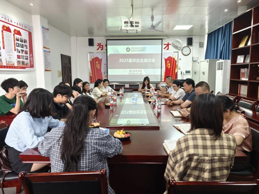 6月18日下午,现代商务学院2025届毕业生代表座谈会在明礼楼1-606会议室温情启幕。学院党总支书记李锦桂、院长严品、学工副院长彭志文、教学副院长谢力雄、22级辅导员及各专业毕业生代表围桌共叙,共话末来发展。