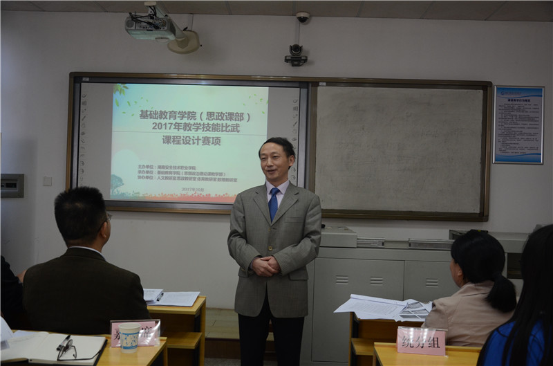 2017年10月20日下午,基础教育学院(思政课部)在知行楼210举办2017年教师课程设计比武大赛(初赛),学院13位专任教师参加此次比武。学校(中心)党委书记李海涛、副院长周劲松受邀出席并观摩比赛,曾大恒、黎鑫、杨娇、肖毅志、刘瑛、夏旭等6位校内特邀评委全程参与比赛,学院党政负责人及教职工全程观摩。比赛由基础教育学院学工办负责人黄金玉主持。