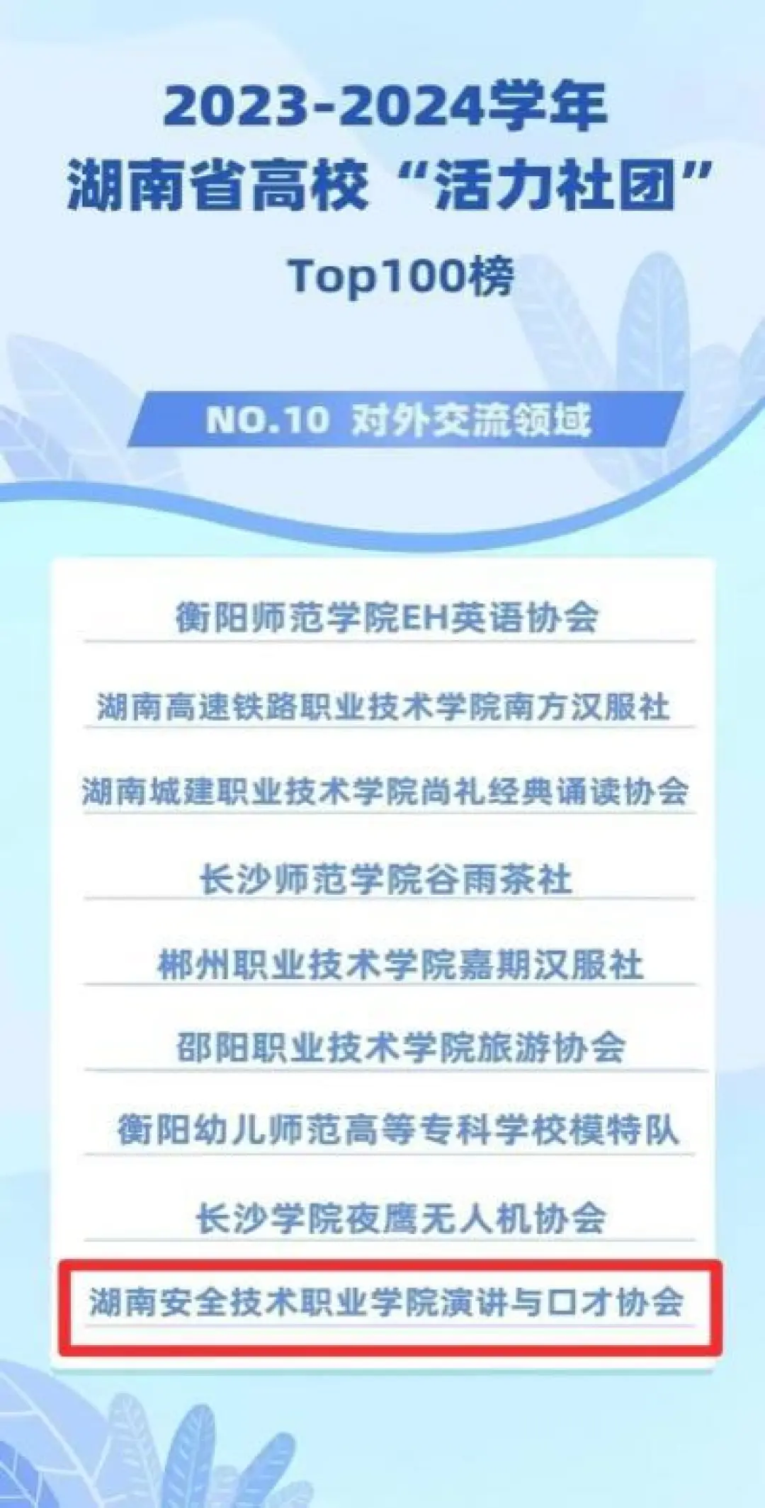 日前,在共青团湖南省委、湖南省学生联合会组织开展的2023-2024学年湖南省高校“活力社团”风采展示活动中,湖南安全技术职业学院演讲与口才协会荣登2023-2024学年湖南省高校“活力社团”TOP100榜。